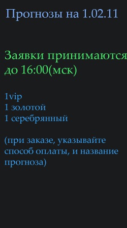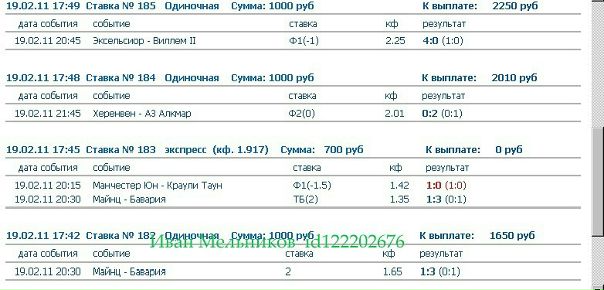 Меня зовут Иван, ставки начал делать еще когда учился в университете, играл в минус, то выигрывал, то проигрывал, так как люблю спорт и немного азартен продолжал ставить) Прошло время и вот 1,5 года назад, я начал выигрывать, играть в хороший плюс,видимо набрался опыта, это не заменило мне работу, но от ставок я получаю прилично, раньше я ставил в конторах , а теперь только через интернет(намного удобнее),теперь у меня эта страница, и если вам интересно: Я предоставляю свои VIP прогнозы В день я даю 1 или 2 vip прогноза. коэффициент 1.7 - 5 проходимость 80% в случае не прохода ставки, вы за нее не платите. и следующий прогноз получаете бесплатно vkontakte.ru/id122202676 649-155-956 icq для связи. покупки моих услуг. предложений. общение исключительно уважительное, мат, неуважение - бан